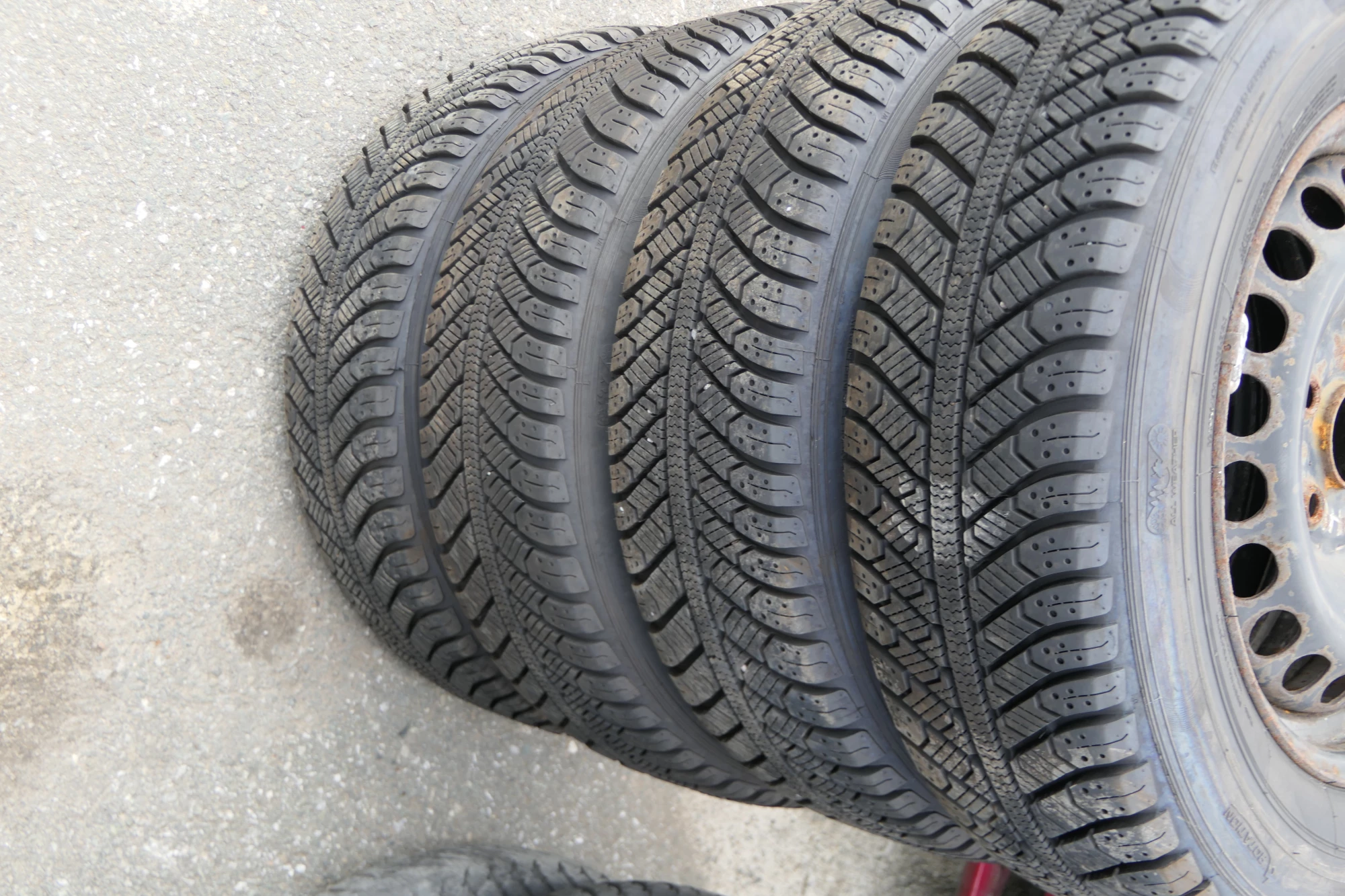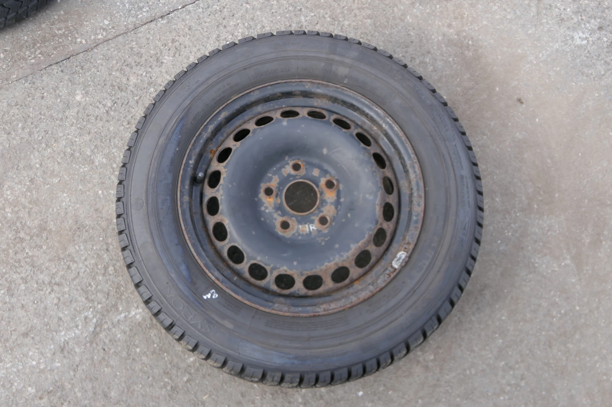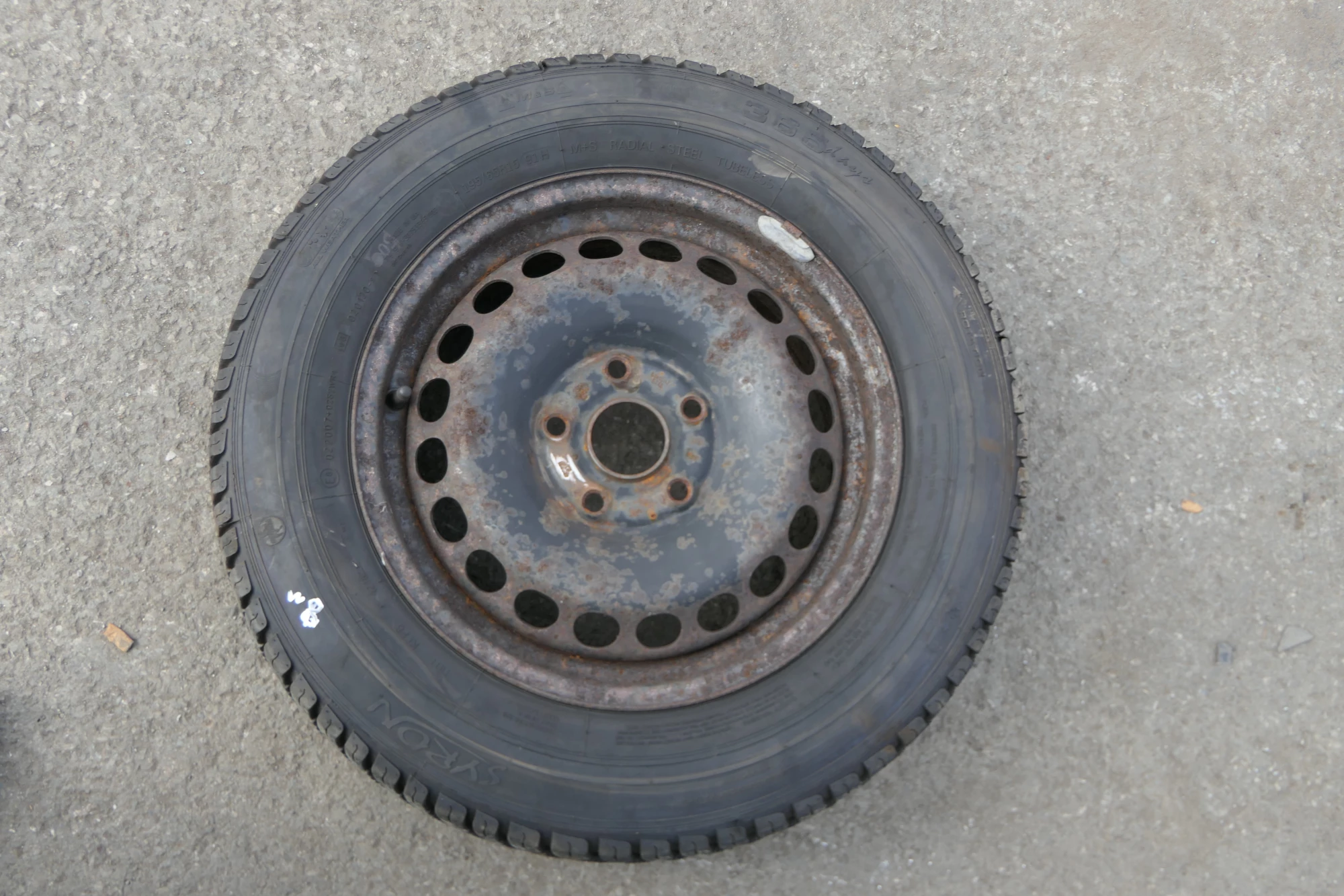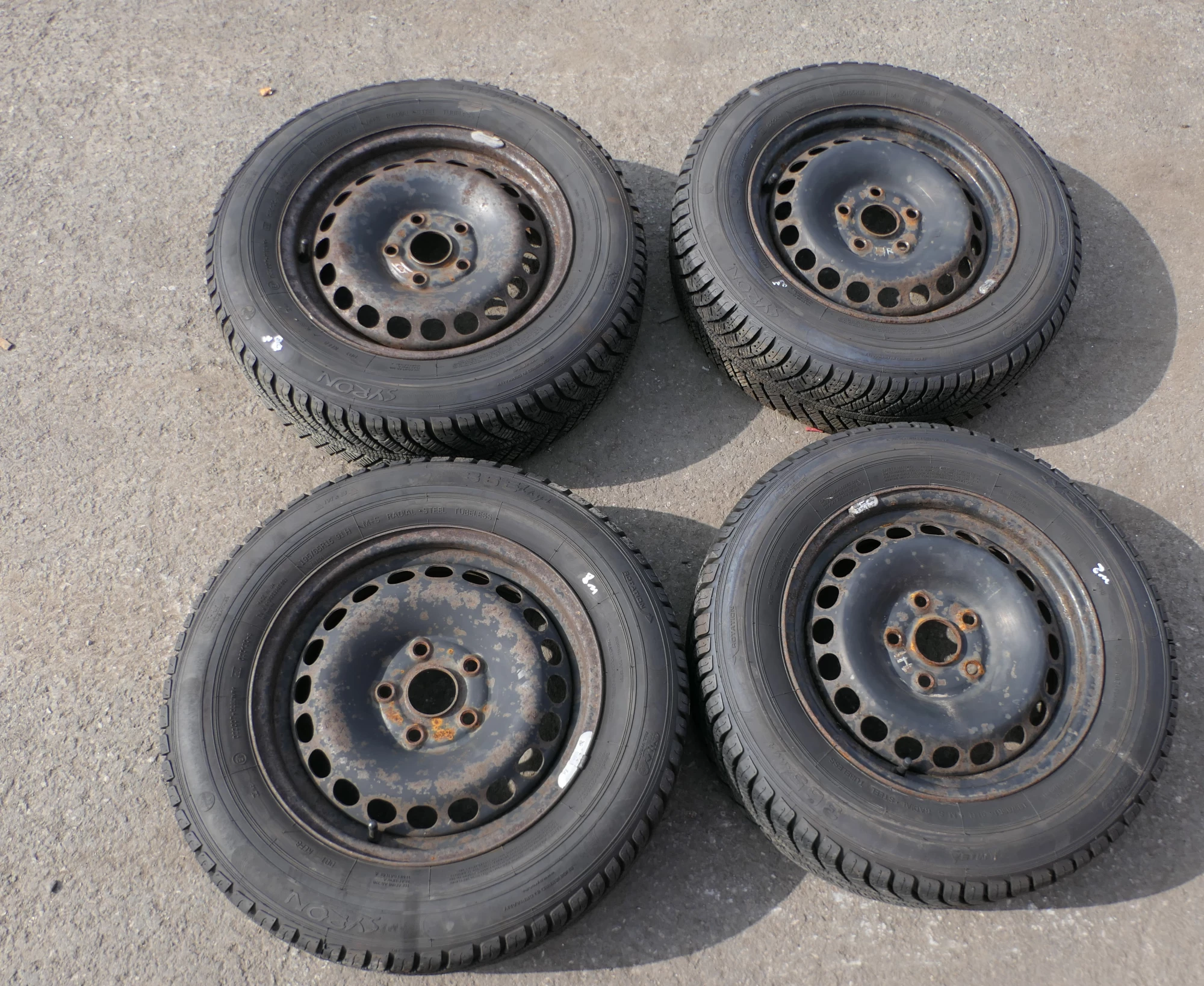 Angeboten wird ein Satz Stahlfelgen mit Winterreifen 195/65 R15 91T von Syron, Herstellung 1218 mit ca. um die 8 mm je Reifen auf Felge 6jx15H2 ET45 aus einem Audi A6 4B Bj. 2000.