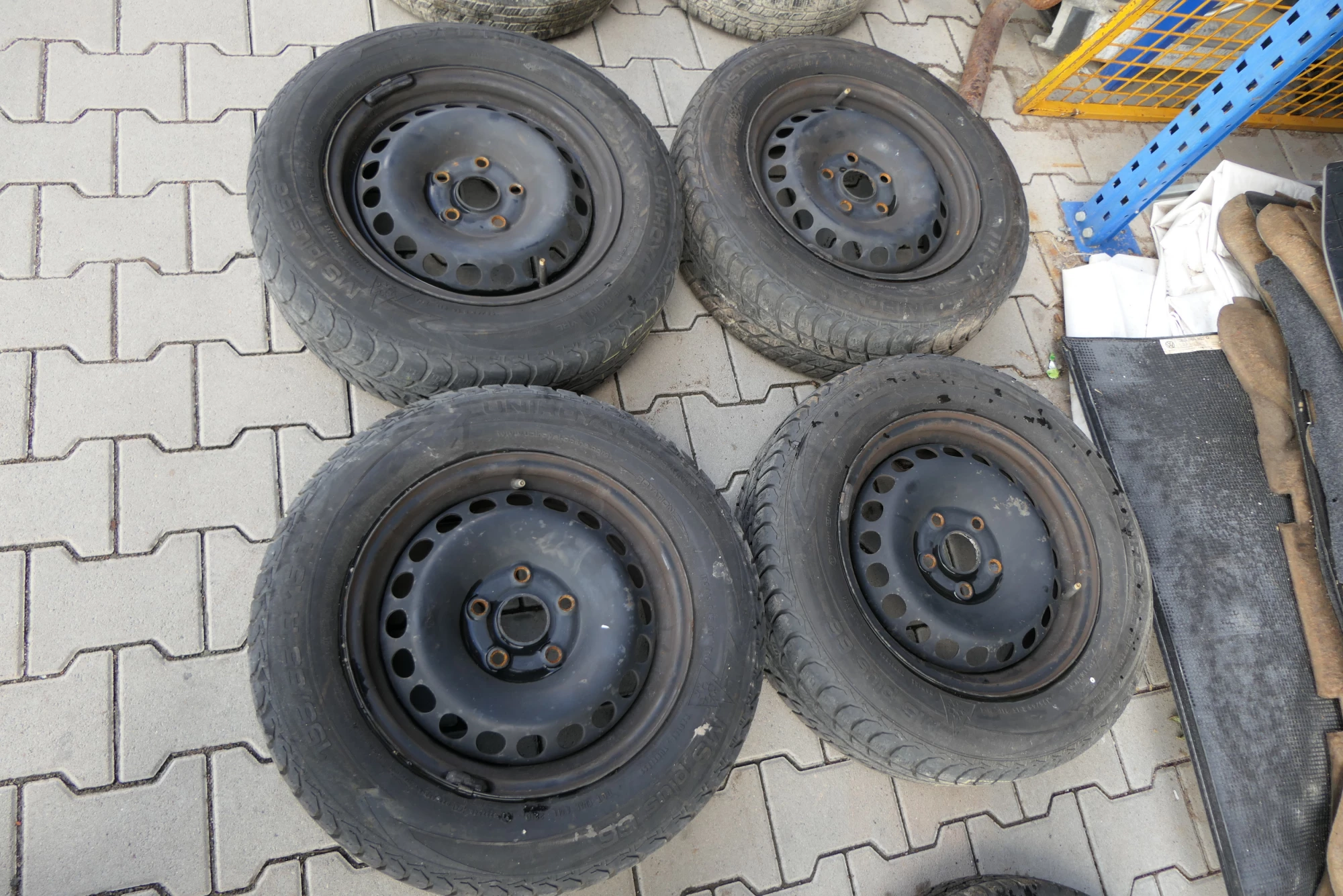 Angeboten wird ein Satz Stahlfelgen mit Winterreifen195/65 R15 91T von Uniroyal, Herstellung 2210 mit ca. um die 5 mm Profil je Reifen auf Felge 6jx15H2 ET45 aus einem Audi A6 4B Bj. 2000.