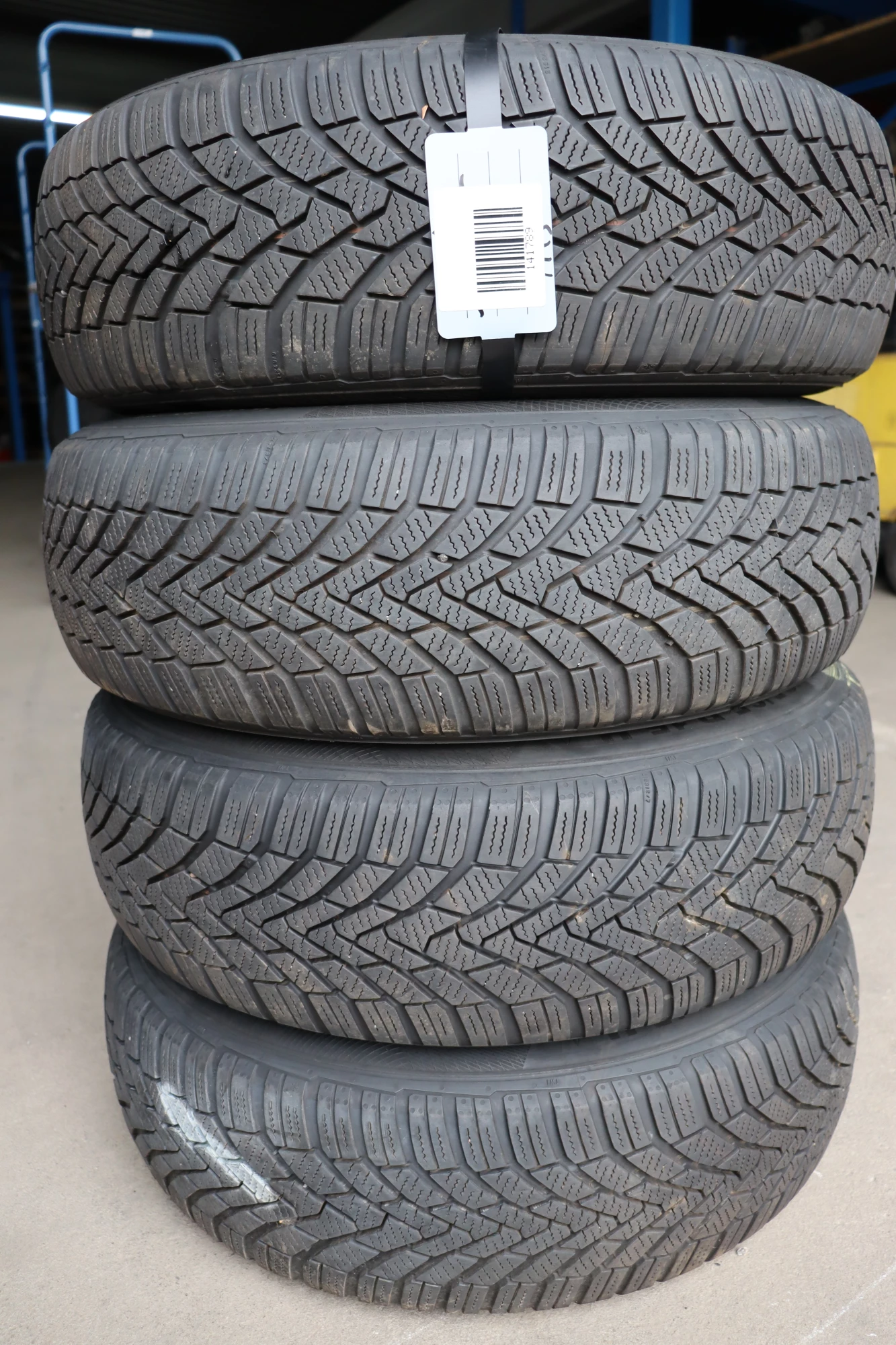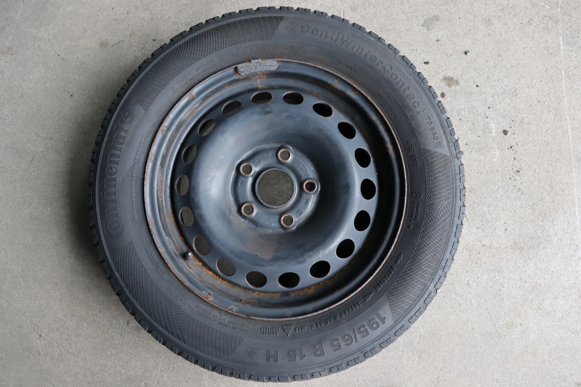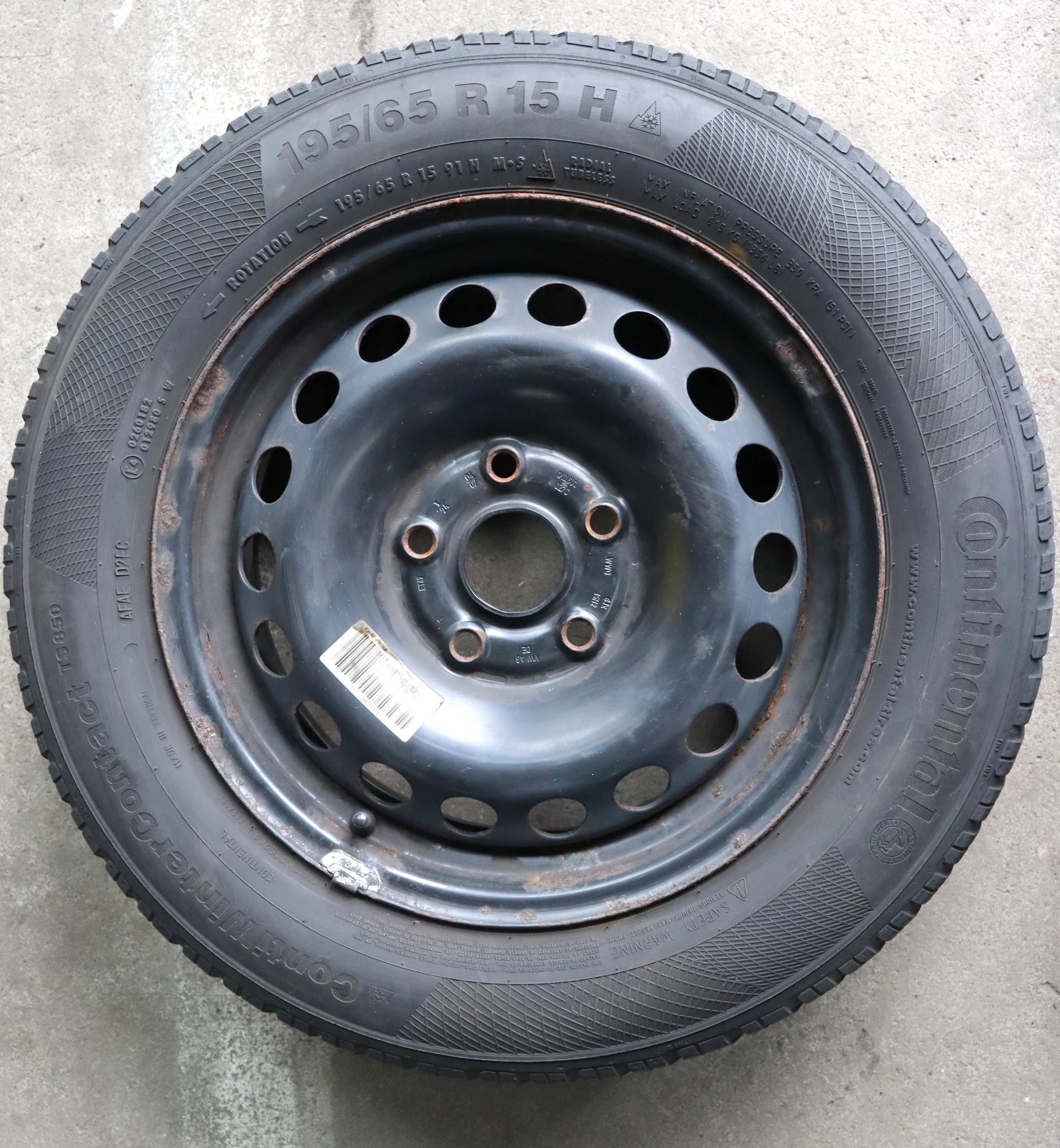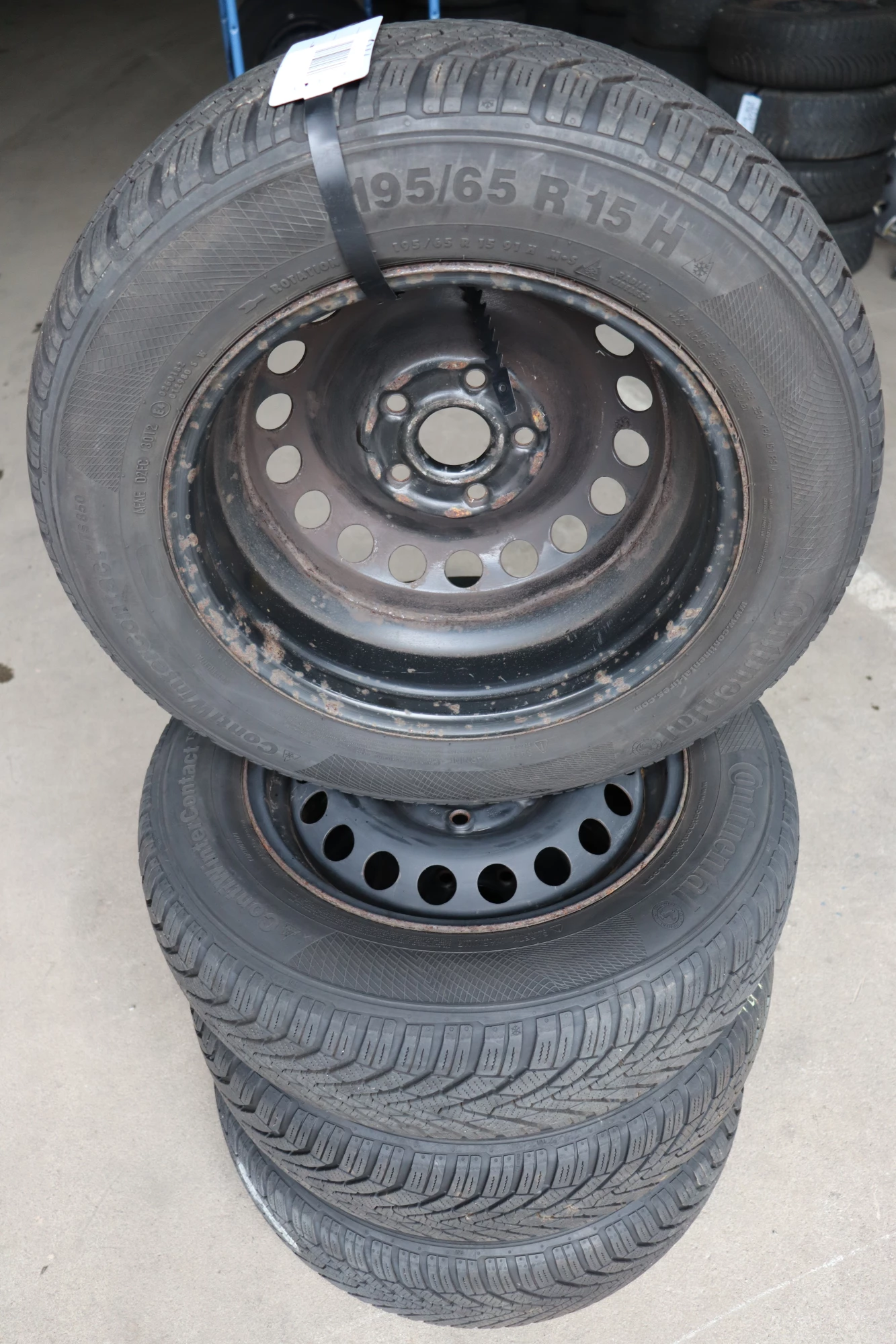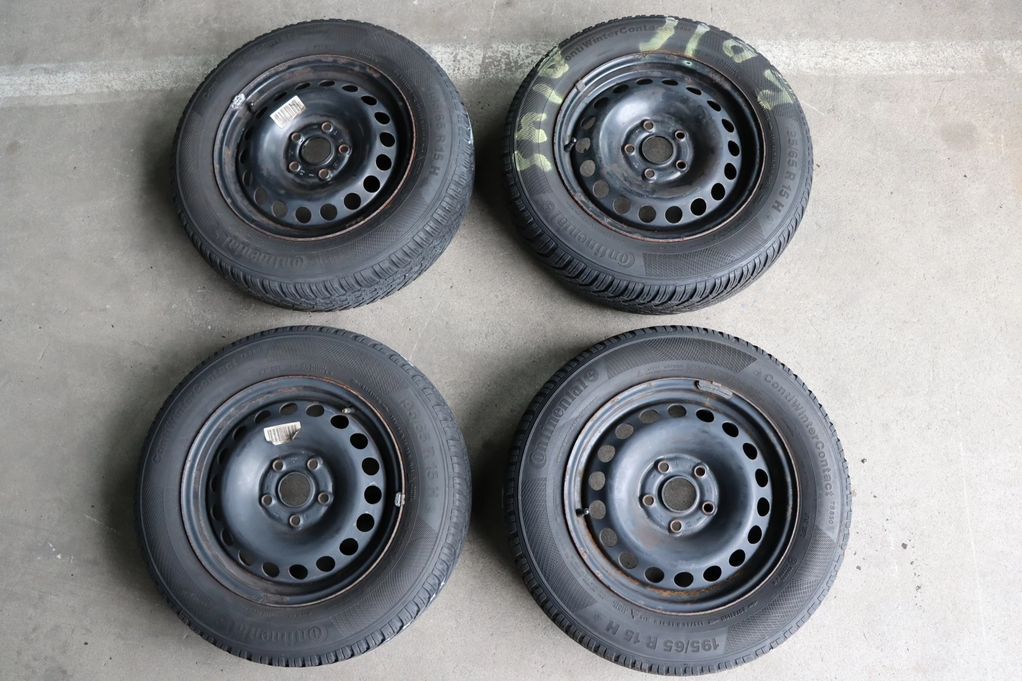 Angeboten wird ein Satz Winterreifen mit ca. 2x um die 7 mm Profil von Continental, Herstellung 3012, 195/65 R15 91T auf Felge 6jx15H2 ET47 aus einem VW Golf 5 Bj. 2006.